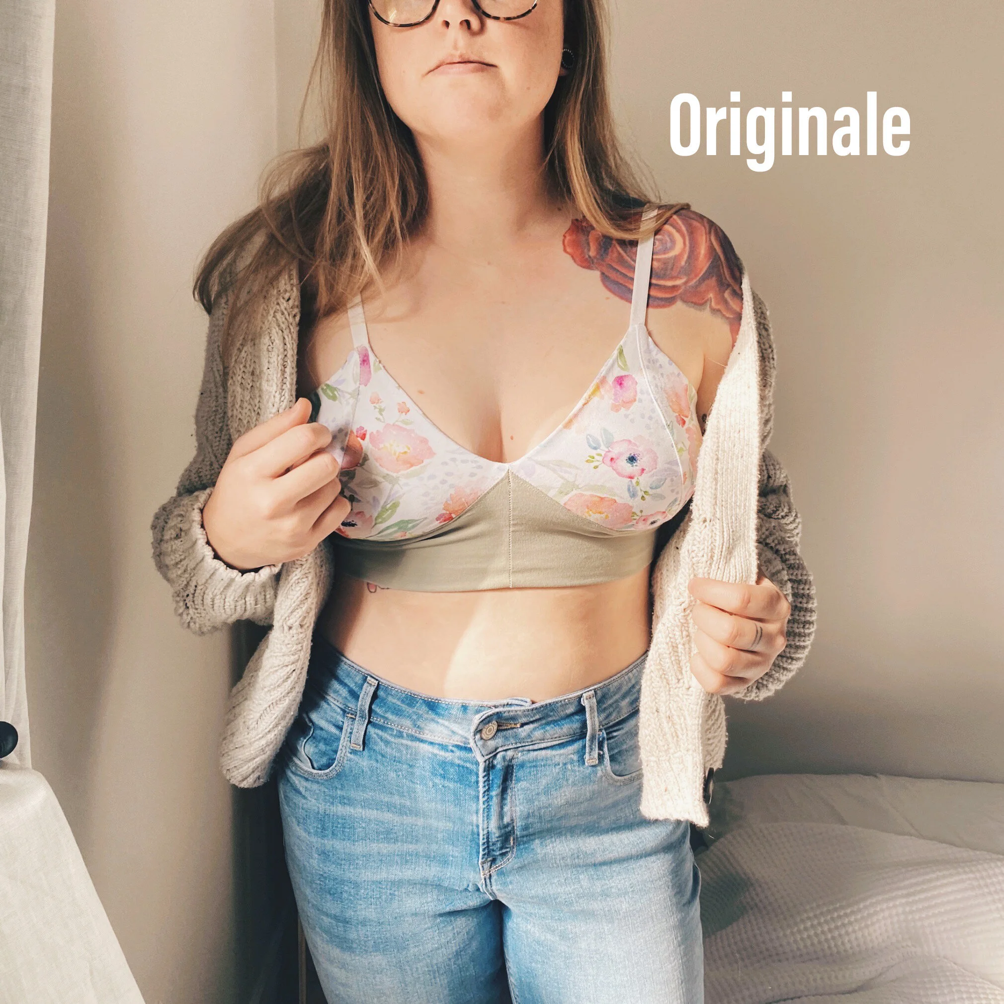 La Originale: Elle offre plus de soutien que la Naturelle. Elle est fait en plusieurs morceaux. C’est un style ‘bonnet’ avec une bande ajustée. Le bonnet est fait avec du double polyester brossé. La bande est fait de coton lycra. Les bretelles sont ajustables tandis que le tour de buste ne l’est pas. Elle ne contient pas de pads. Cette bralette est doublée (elle est fait de deux épaisseurs). Les grandeurs offertes sont de tour de buste de 28 à 42 et le bonnet jusqu’à DDD (F).